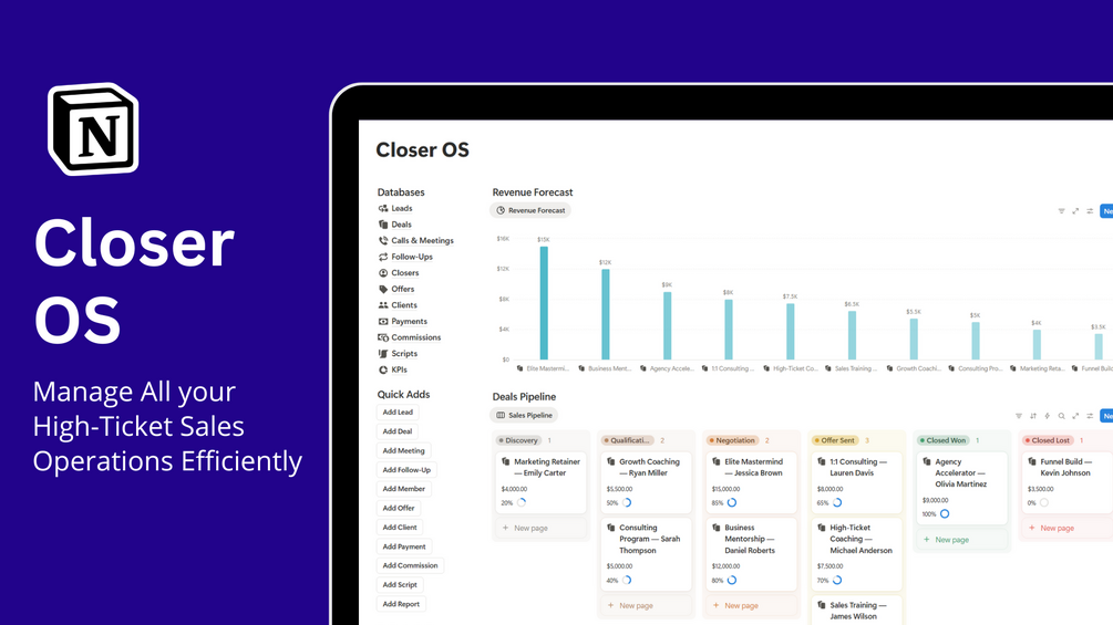Closer OS is a premium Notion system built for high-ticket closers, sales teams, agencies, and consultants who sell through calls and want a clear, structured, repeatable sales process.
