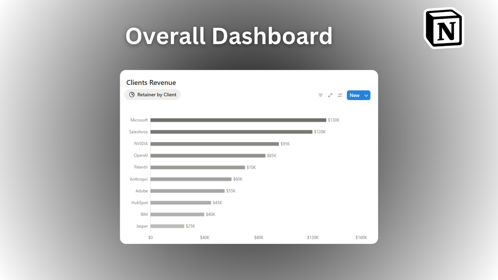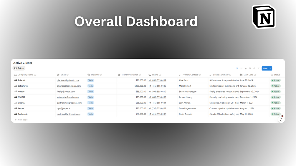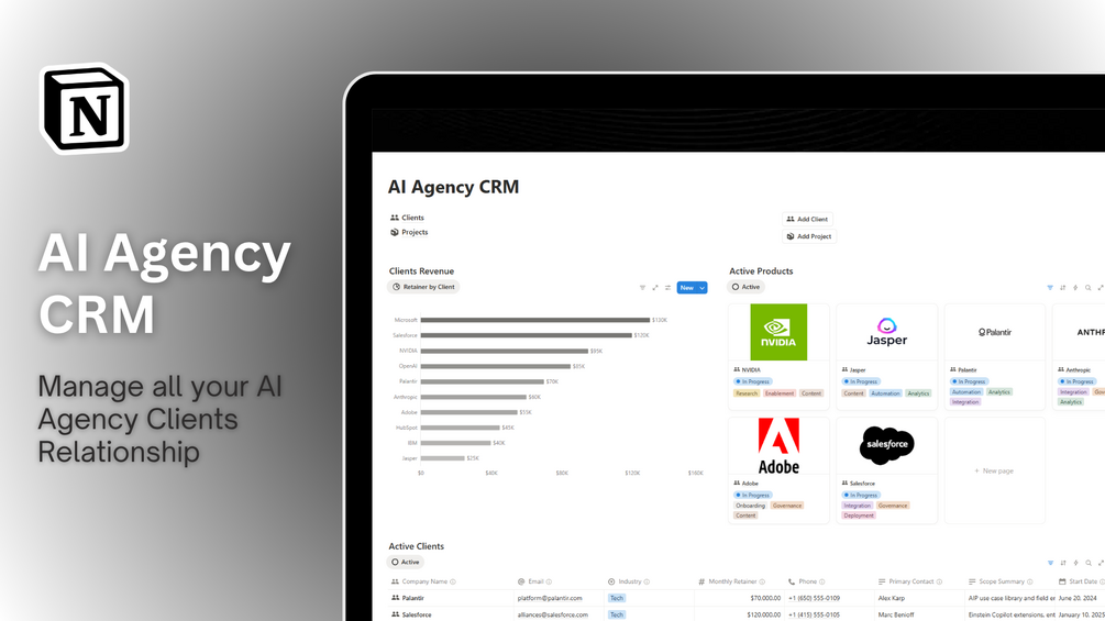 The AI Agency CRM free template is designed for small AI agencies or freelance AI consultants who want a streamlined way to manage their client relationships. With this template, you can track leads, active clients, and past interactions all in one place. Each client entry can include project details, contact information, AI services requested, and notes on communication. This version includes a simple dashboard showing active clients and upcoming follow-ups.