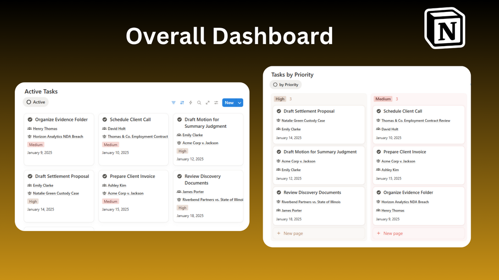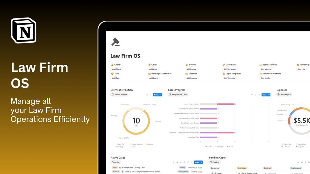 Law Firm OS is a complete Notion workspace built for attorneys, law firms, and legal teams who want to manage clients, cases, billing, documents, and finances — all in one simple and powerful system.