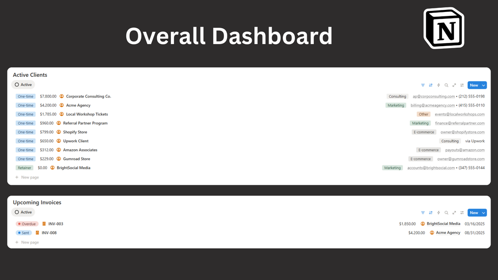 Even in the free version, this template gives you a clear picture of how each client contributes to your business’s success. The Premium version inside Business Finance OS unlocks automation, cross-database syncing with invoices and expenses, and AI-powered revenue analytics to optimize your client strategy.