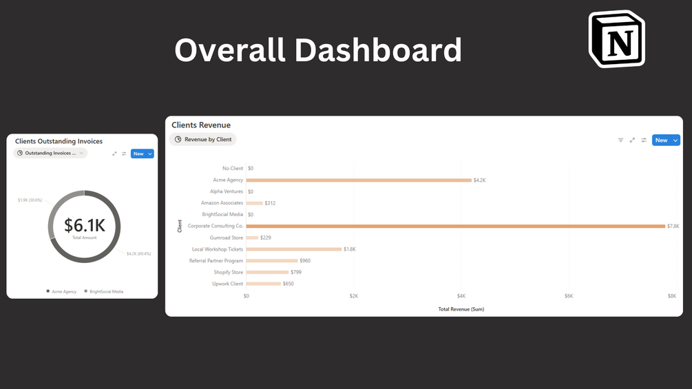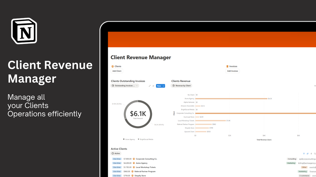 The Client Revenue Manager is a Notion template built to help business owners and freelancers track and analyze revenue generated from each client. It’s your go-to system for understanding which clients bring the most value, keeping your payments organized, and building stronger, data-backed client relationships.
