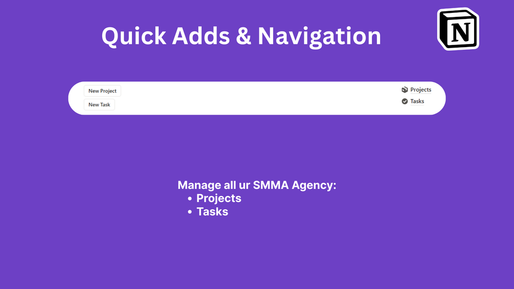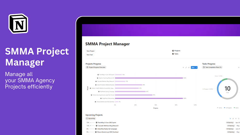 The SMMA Project Manager is your all-in-one Notion system to manage every creative and advertising project from start to finish — with clarity, precision, and organization.