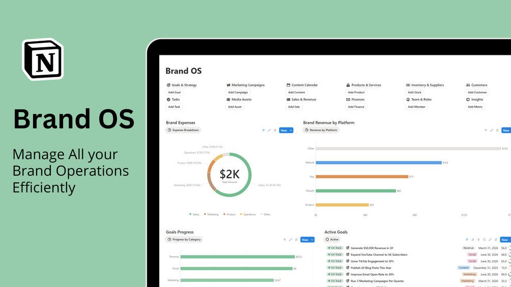 Built specifically for brand owners, e-commerce managers, and startups, this Notion template acts as your central command center. Visualize your progress with dynamic charts, manage active tasks, and keep your team aligned with your goals. Whether you are tracking brand expenses or planning your next big campaign, Brand OS gives you the clarity you need to scale.