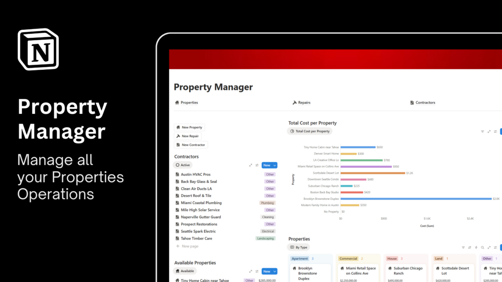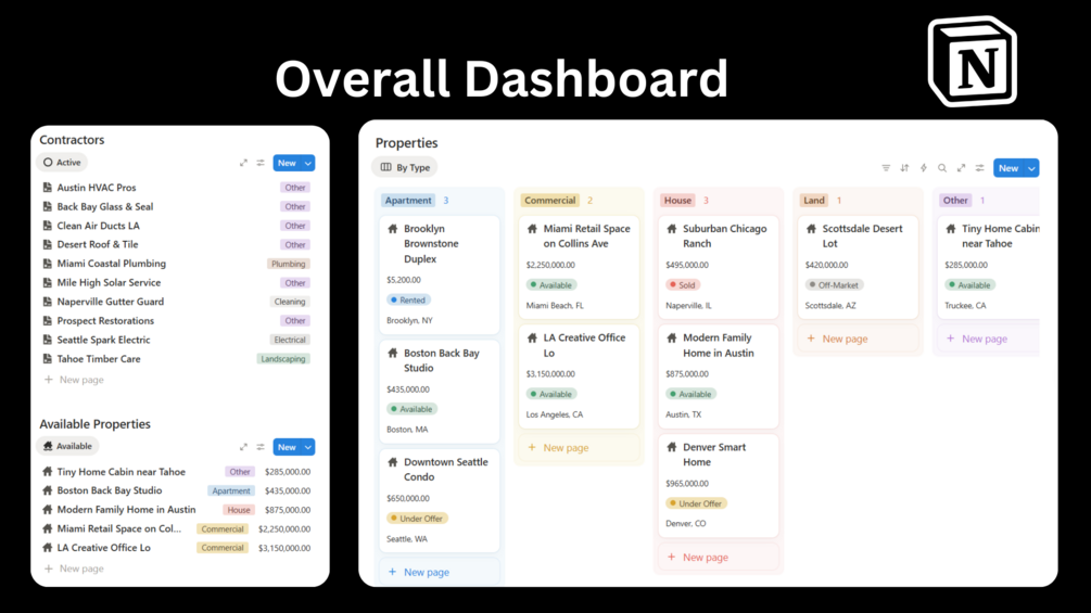 - Properties Database → Address, status, value, linked owner, and occupancy.