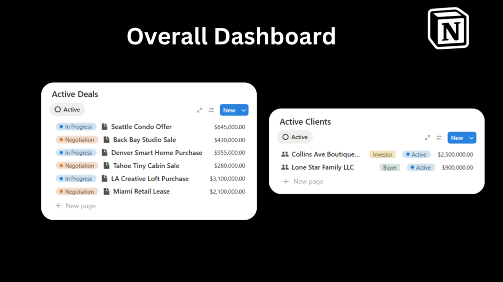- Clients / Leads Database β Track lead sources, engagement, and follow-ups.