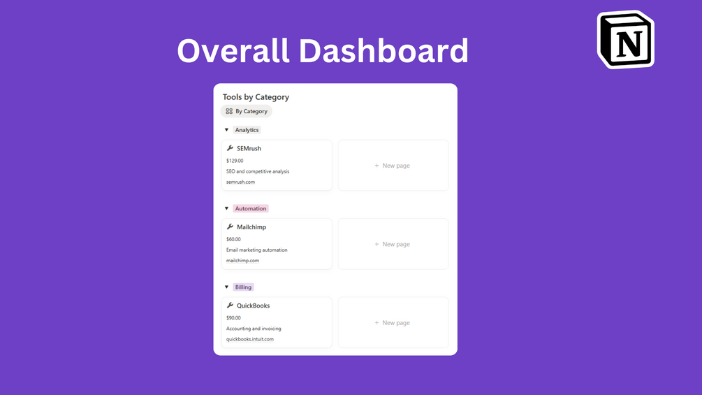 - Categorize tools by type — from analytics and content creation to CRM, billing, and automation.