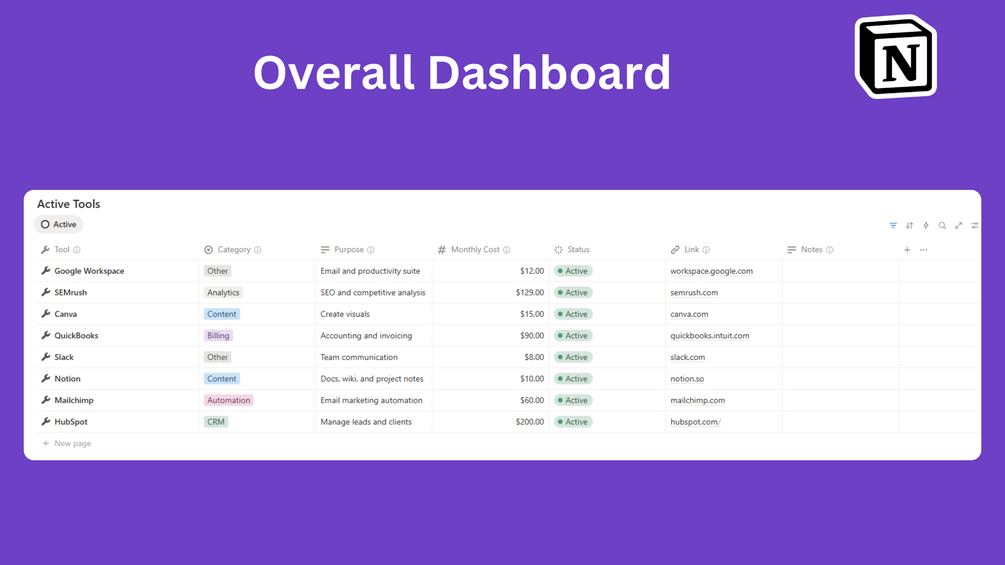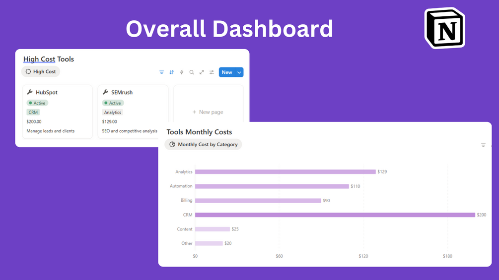 Built for agency owners and marketing teams who value efficiency, this Notion template helps you organize, monitor, and optimize your entire tool stack — so nothing slips through the cracks.