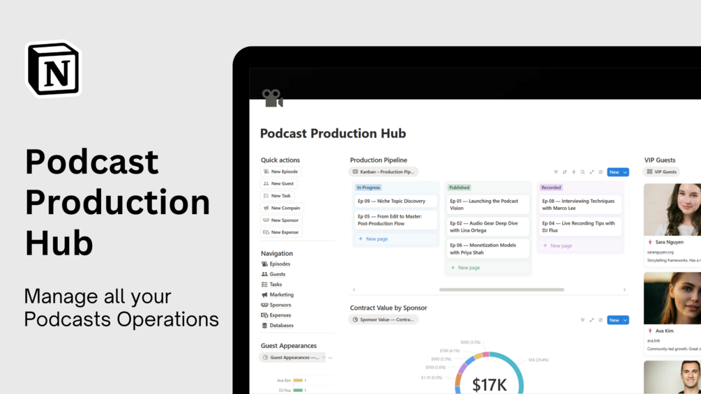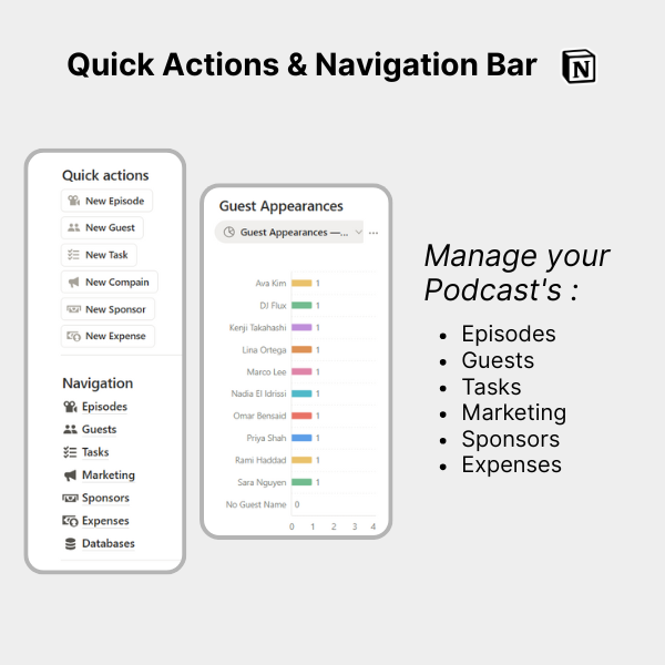 - π¬ Episodes Database: Track episode status, release dates, duration, and link guests, sponsors, tasks, marketing campaigns, and expenses.