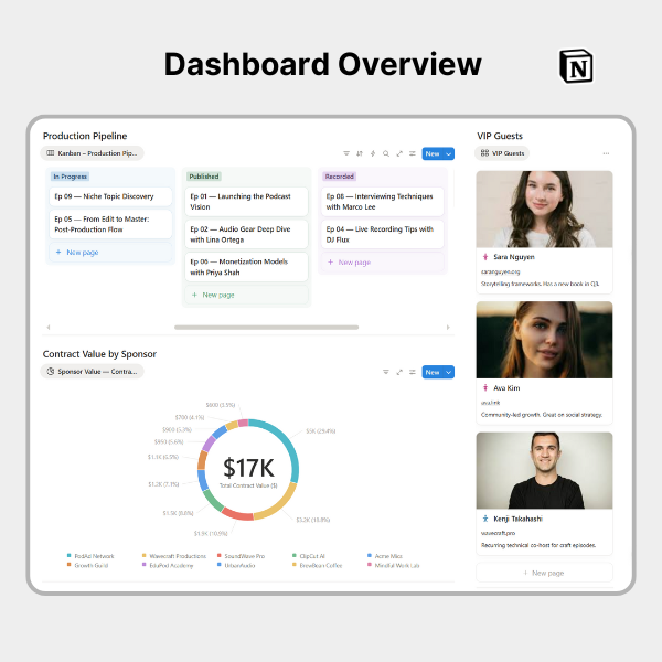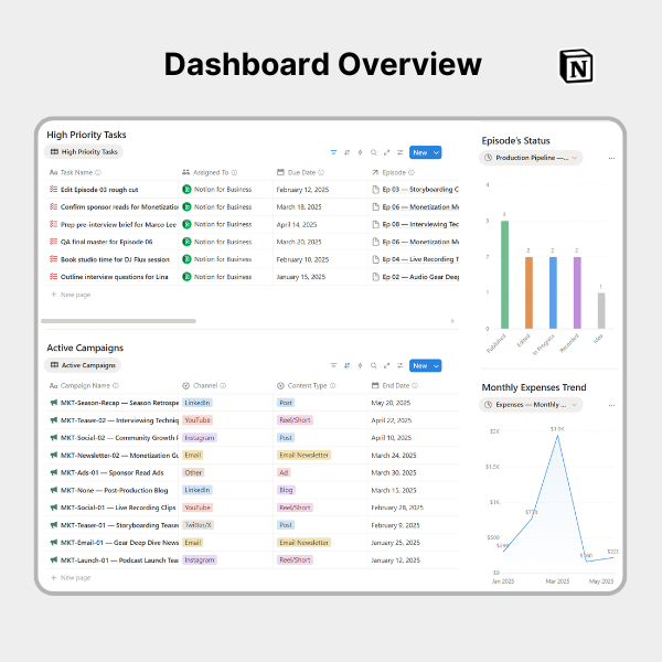 - π¨ Ready-to-use Charts & Views: Pre-built visuals for episodes, guests, tasks, marketing, sponsors, and expenses.