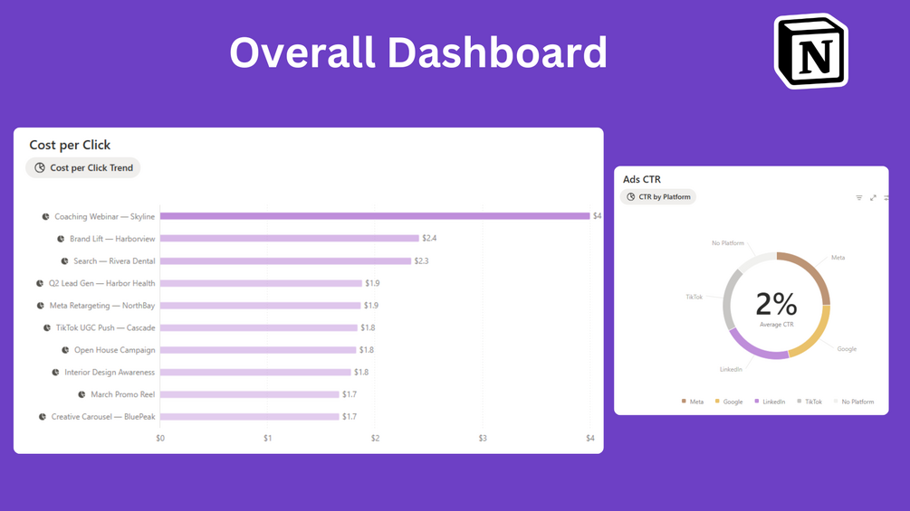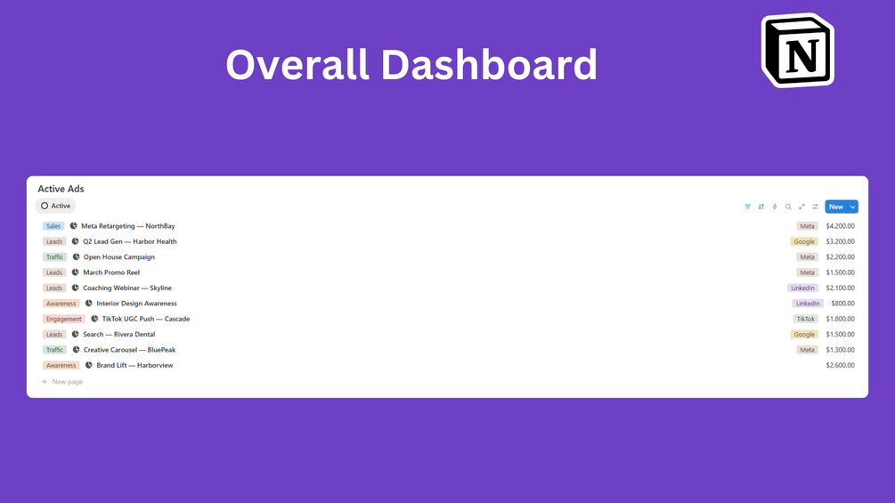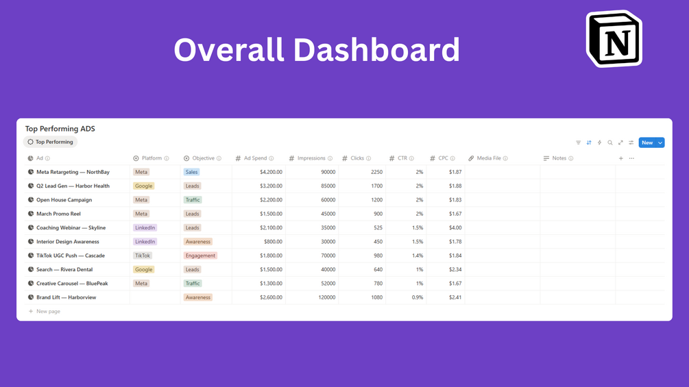 Built for marketing agencies, media buyers, and performance marketers, this template lets you easily track your ad visuals, copy, metrics, and results — so you always know what works and what needs improvement.