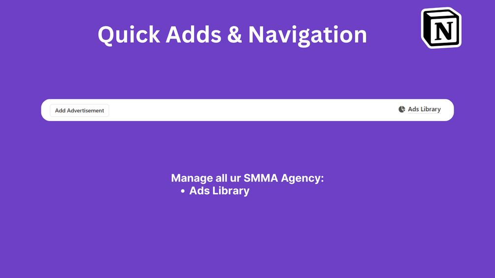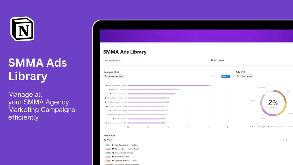 The SMMA Ads Library is a powerful Notion system to organize, analyze, and optimize all your advertising creatives in one central place.