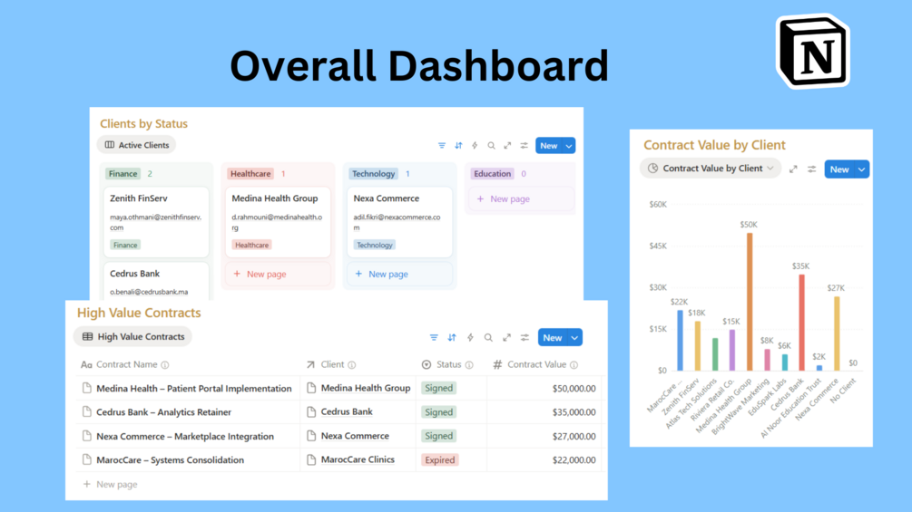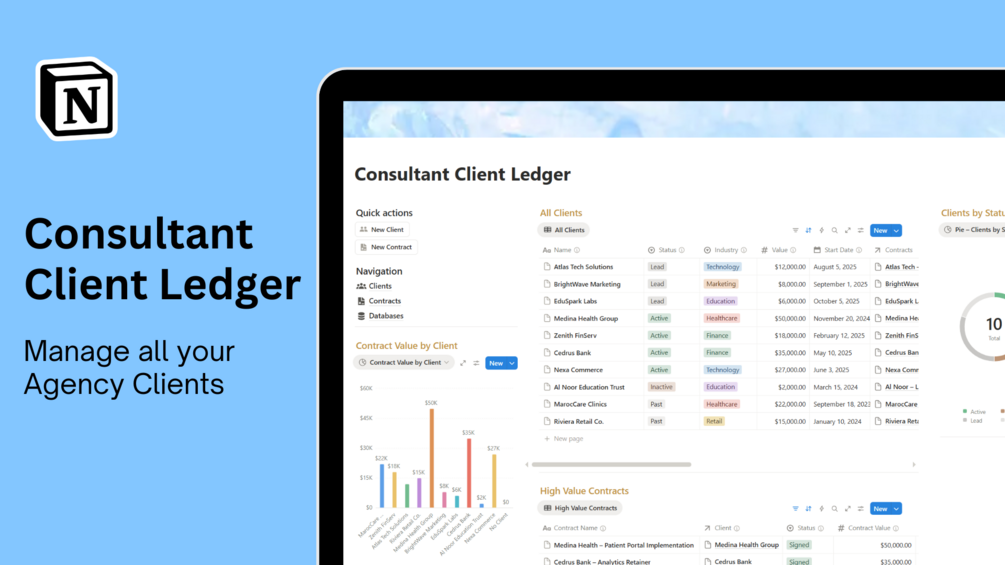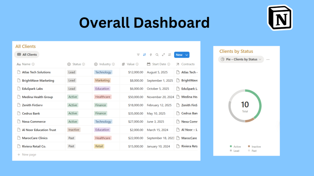 - Centralizes client details (contacts, industry, value).