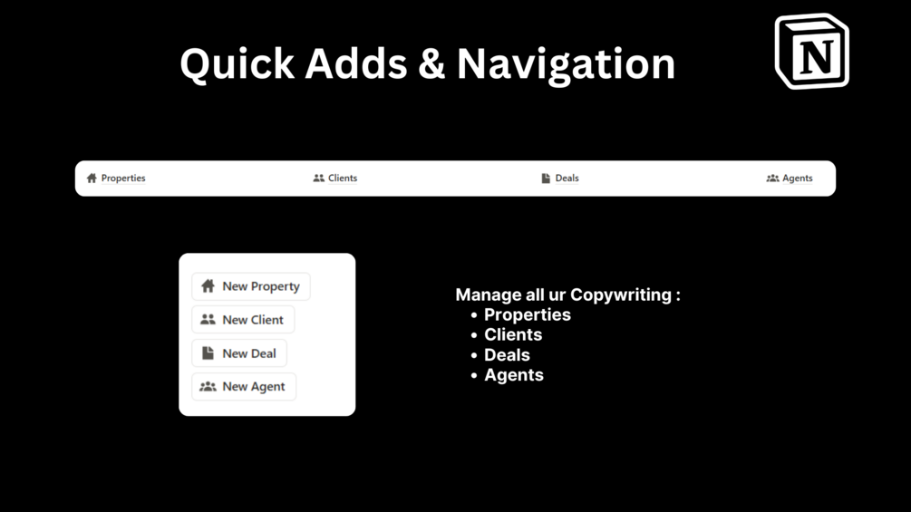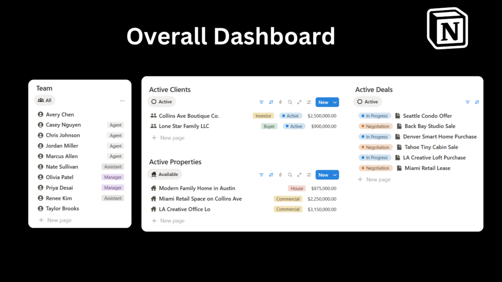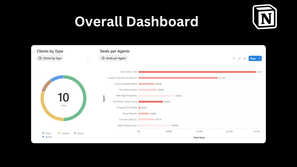 - Deals Database → Track every transaction in your pipeline, with deal value, stage, and linked clients.