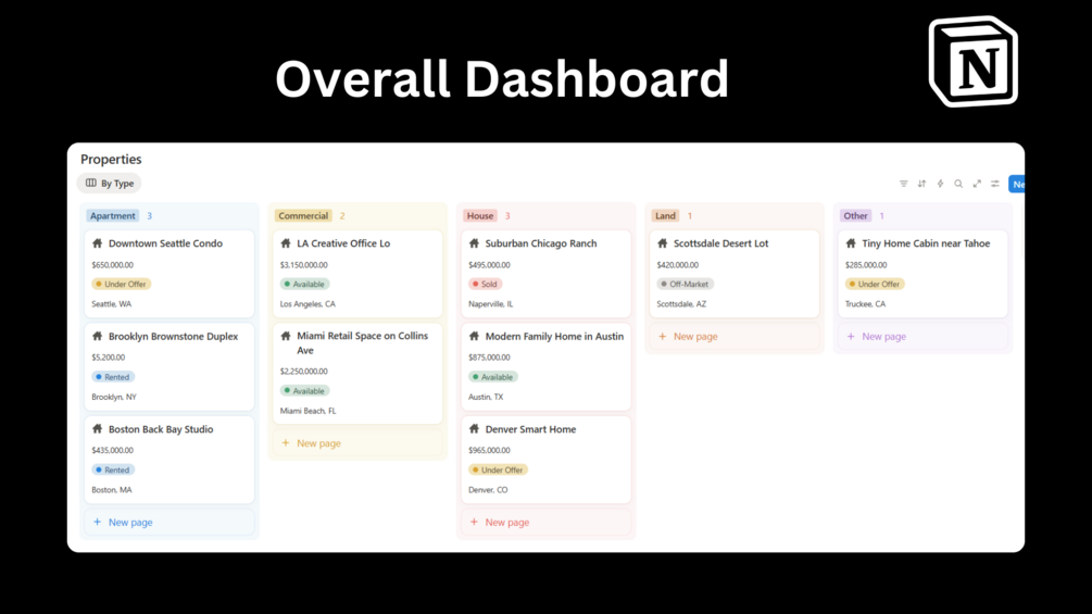 - Clients Database → Store all contacts, with fields for status (Lead, Active, Past), property interest, and contact details.