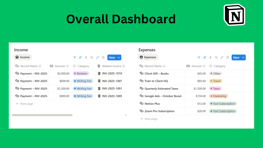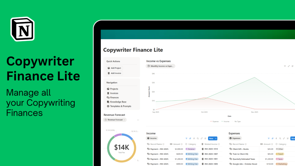 Managing finances as a copywriter can be overwhelming — invoices, payments, late clients, and revenue goals scattered across emails or spreadsheets. This minimalist system gives you a clear and simple view of your freelance income so you always know where your money is coming from.