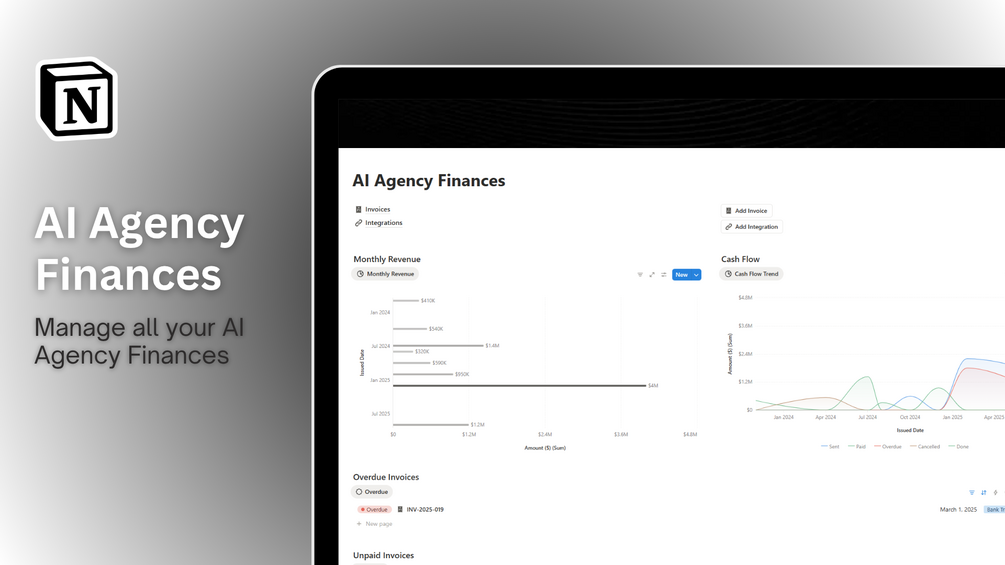 The AI Agency Finance template provides a simple and organized way to manage your agency’s finances. Track invoices, expenses, and client payments in one central location. This template is perfect for small AI agencies or freelancers who want a clear overview of cash flow and financial health without complicated spreadsheets.