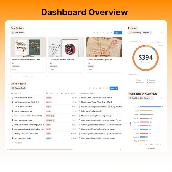 - Expense Tracker – Categorize and visualize shipping, materials, ads, and other costs.