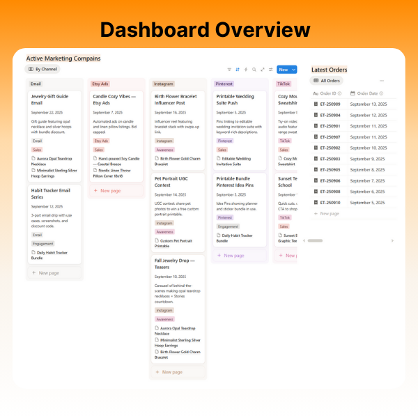 - Marketing Planner – Organize active campaigns across Email, Instagram, Pinterest, TikTok, and Etsy Ads.