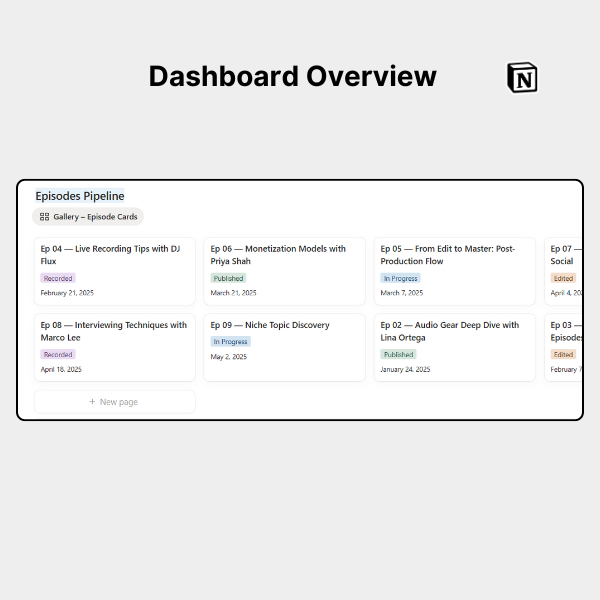 Podcast production has many moving parts—research, recording, editing, and publishing. The Podcast Task Tracker is a free Notion template built to help podcasters stay on top of their workflow without the complexity of a full operating system.