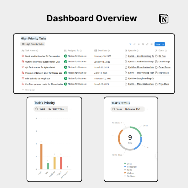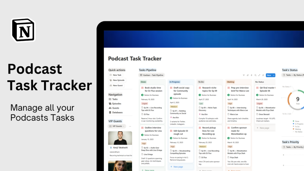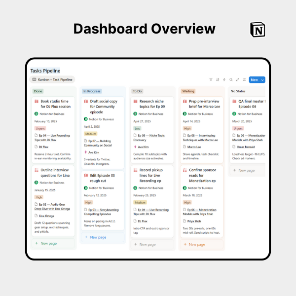 Podcast production has many moving parts—research, recording, editing, and publishing. The Podcast Task Tracker is a free Notion template built to help podcasters stay on top of their workflow without the complexity of a full operating system.