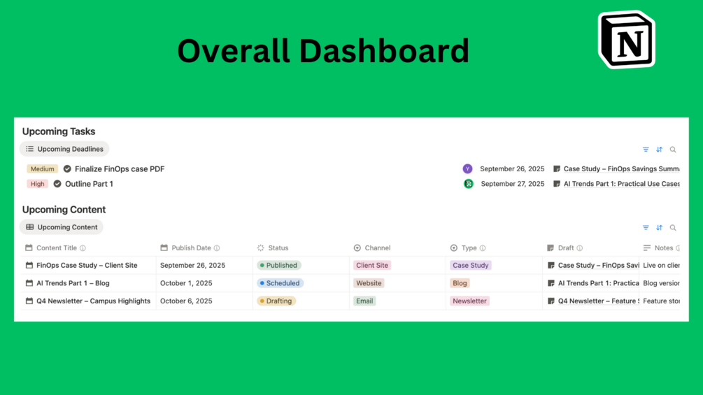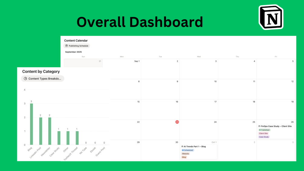 - Content Calendar & Portfolio β Plan content, schedule posts, and showcase your published work professionally.